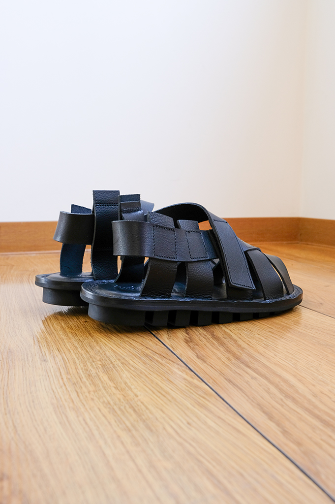ベルト状のレザーをクロスさせたうえでしっかりと足を包み込む角度でつけられたアートっぽさと履き心地が両立した存在感あるサンダルです。脱ぎ履きは足の甲にこっそり仕込…
