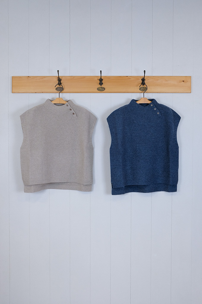 エスクストラファインラム100%。高級感と膨らみある編み地が魅力的なnumeの冬ニット。はじめてベストをご用意できました。 ドロップショルダーモックネック+開閉できる釦を3つ並べ衿遊びでき脇スリット+後ろ下がり ”ほっくり”な印象ながらスタイリッシ... -